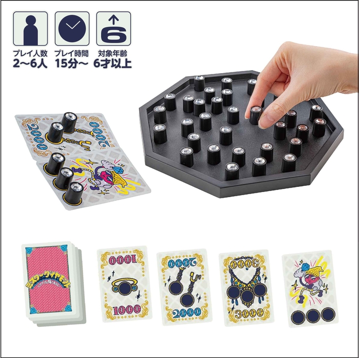 にせダイヤに騙されないようにして、本物のダイヤを取り、アクセサリーを完成させて得点を競うゲームです。盤上には、取ることができる本物のダイヤ42個、盤に固定されて取ることができない偽物のダイヤ26個が配置されています。とることができた本物のダイヤは、アクセサリータイルに置き、アクセサリーを完成させます。完成させたタイルに記載されているポイントを獲得となります。アクセサリータイルは1,000点、2,000点、3,000点と、横取りタイルの4種類があります。横取りタイルを獲得すると、他のプレイヤーが獲得したアクセサリータイルを奪うことができます。プレイ人数に応じた目標点をいち早く達成させたプレイヤーが勝者となります。あるいは、タイルの山札が0枚になった時にはその時点で最多得点者が勝者となります。