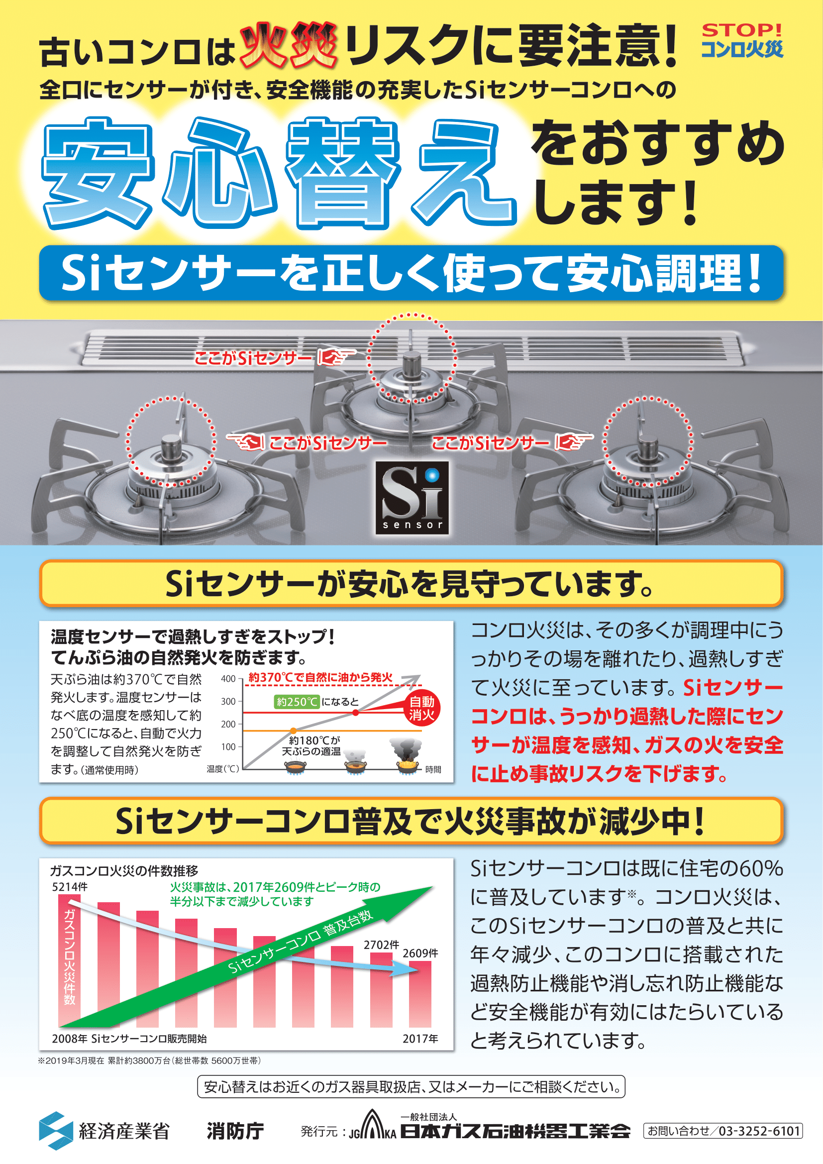 当工業会では、ガスコンロの火災事故撲滅のため、Siセンサーコンロへの『安心替え』をお勧めしております。