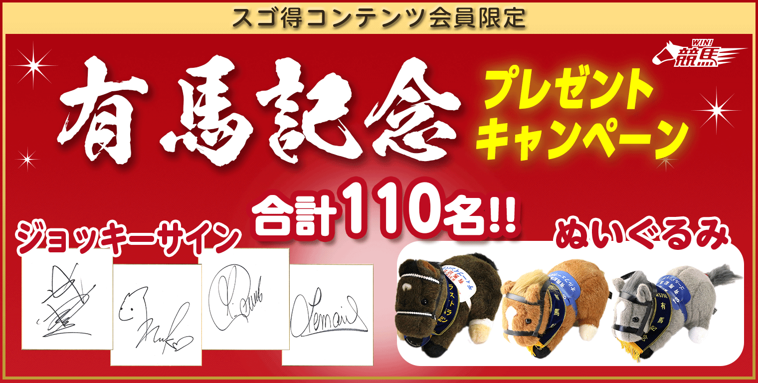 スマートフォンコンテンツ提供サービスを運営する株式会社デジマース(本社:東京都品川区、代表取締役社長:石川達絵)は、2017年12月8日11時より、株式会社NTTドコモ「スゴ得コンテンツ(R)」内で提供中の「WIN!競馬 forスゴ得」利用者を対象に、「『有馬記念』開催記念プレゼントキャンペーン」を実施いたします。本キャンペーンでは、競馬界のレジェンド<武豊騎手>やJRA女性騎手年間最多勝記録を更新した<藤田菜七子騎手>、リーディングジョッキーを争う<M.デムーロ騎手>や<C.ルメール騎手>のサイン色紙、更に歴代有馬記念優勝馬のぬいぐるみを合計110名様にプレゼントいたします。