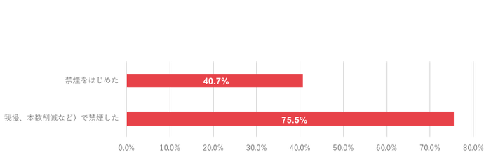 そのうち、禁煙を始めたと回答をしたのは約40%、そのうちの約75%が我慢や本数を減らすなどの自力で禁煙を実施しているという結果でした。
