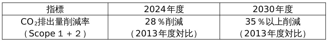 (1)中期経営計画「CAN20」では、自社によるCO2排出量の削減対象をGHGプロトコル(注1)に則り、自社による温室効果ガスの直接排出量(Scope1)に他社から供給された電気などのエネルギー使用に伴う間接排出量(Scope2)を加えたものと定義し、2030年度の目標を2013年度対比「26%削減」という数値目標を設定していました。そして、今回新たに数値目標を、2013年度対比「35%以上削減」へと引き上げました。