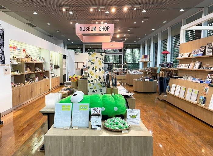 江戸東京たてもの園の入口に建つビジターセンター(旧光華殿)内にある、ミュージアムショップです。江戸東京たてもの園のマスコットキャラクター「えどまる」の関連商品をはじめ、江戸東京たてもの園で人気の「子宝湯」や「前川國男邸」をモチーフにしたオリジナル商品、江戸・東京に関する書籍や酒器・豆皿などの生活雑貨、やかんやほうき、はたきなどの昔ながらの道具、色柄豊富な手ぬぐい、トランプやかるた等の玩具などを取りそろえています。また、ショップ奥のカフェにはお飲み物等をご用意して、みなさまのお越しをお待ちしております。