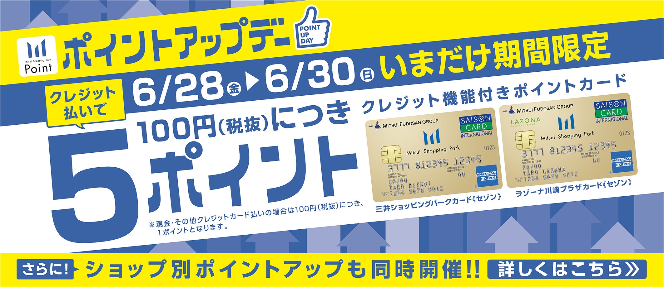 バーゲン期間中の6月28日(金)から3日間、三井ショッピングパークカード《セゾン》のお支払いで、三井ショッピングパークポイントが100円(税抜)につき5ポイントたまる、「ポイントアップデー」も同時開催。バーゲンのお買物を楽しみながらポイントがお得にたまるチャンスです!ぜひ、この機会をお見逃しなく!!