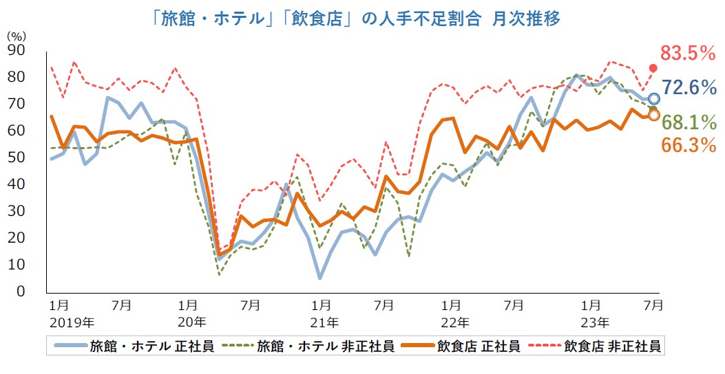 帝国データバンクが2023年8月に発表した「人手不足に対する企業の動向調査(2023年7月)」では、飲食店における人手不足割合が、正社員66.3%、非正社員83.5%と、いずれも高水準であり、飲食業界全体での人手不足は深刻な状態であることが伺えます。