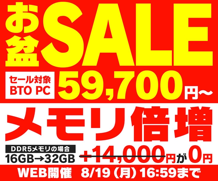 パソコン工房インターネット通販ではただいま対象BTOパソコンの搭載メモリ容量が倍増になる『お盆セール』を8/19(月)16:59まで実施中!