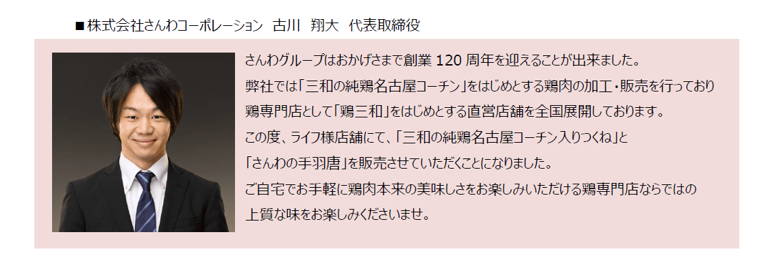 スーパーマーケット“ライフ”の応援・支援企画 鶏専門店「鶏三和」を展開するさんわグループの人気商品を支援販売