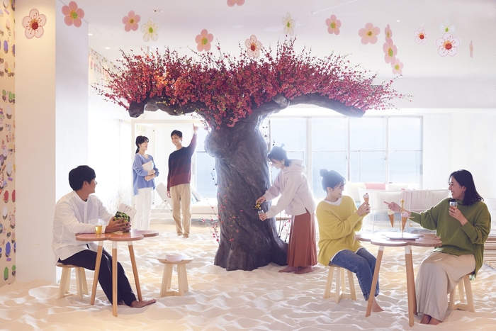 梅の花の形や色味を活かしたテーブルやいす、ガーランドなどが設えられた空間で、思い思いのひとときを過ごせます。梅型のこたつと梅の花の装飾が設えられたテラスでは、眼下に広がる海の青色と紅梅色のコントラストを楽しむことが可能です。春告げ草である梅に囲まれ、ドリンクを飲んだり読書をしたりしながら、一足早い春の訪れを存分に感じることができます。