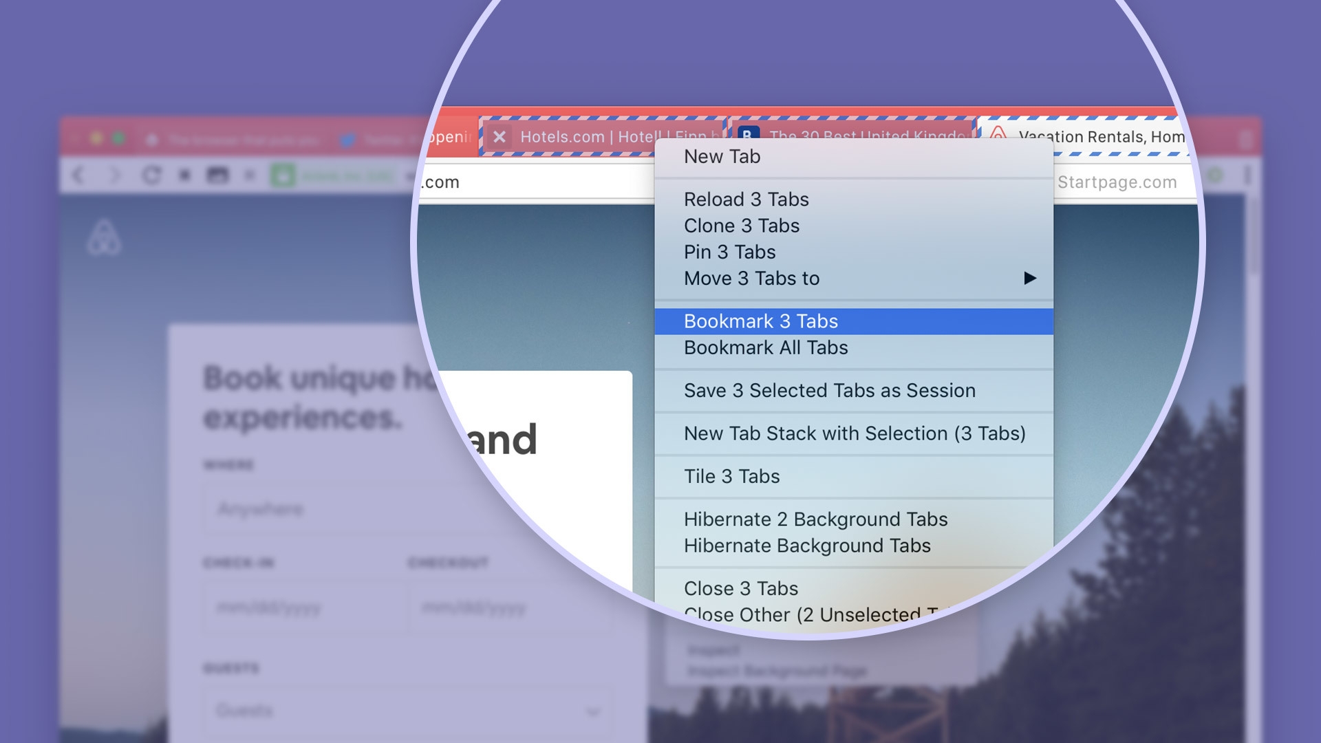 シフトまたはCtrlキーを押しながらいくつかのタブを選択したら、コンテキストメニュー(右クリック)かクイックコマンドまたは専用のキーボードショートカットを使って、複数のタブをまとめてブックマークできます。ブックマークは、タイムスタンプが名前になったフォルダに保存されます。もちろん、後からブックマークマネージャーで編集も可能です。