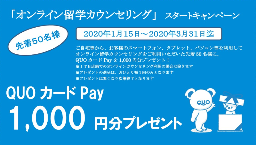 いったい何から準備をしたらいいの?どこの国がおすすめ?そもそも私の語学力で留学なんてできるの?そんな相談も留学カウンセラーが親切丁寧にアドバイスをいたします。相談だけならいつでも無料!お気軽に留学カウンセラーへご相談ください。きっとあなたの不安も解消されるはず!今なら、「オンライン留学カウンセリング」で相談するだけでQUOカードPayがもらえるキャンペーンも実施中!先着50名様!早い者勝ちです!