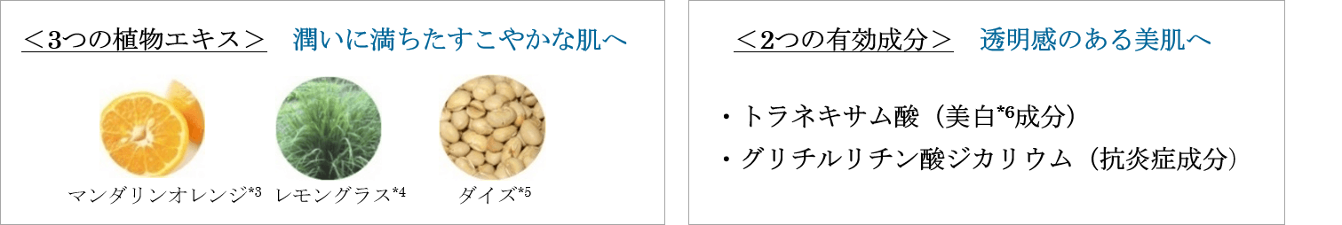 ◆3つの植物エキスと2つの有効成分を配合。透明感のあるすこやかな肌へ