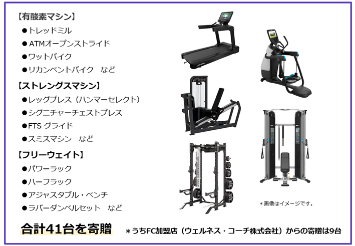 今回寄贈したマシンは計41台で、有酸素運動を行うランニングマシンから、本格的なウェイトトレーニング機材まで、幅広いトレーニングニーズに対応した機材となっています。寄贈に際し、当社が展開する24時間年中無休フィットネスジムにFC企業として参画するウェルネス・コーチ株式会社も今回の取り組みに賛同し、41台のマシンの内、9台のマシン寄贈を行いました。