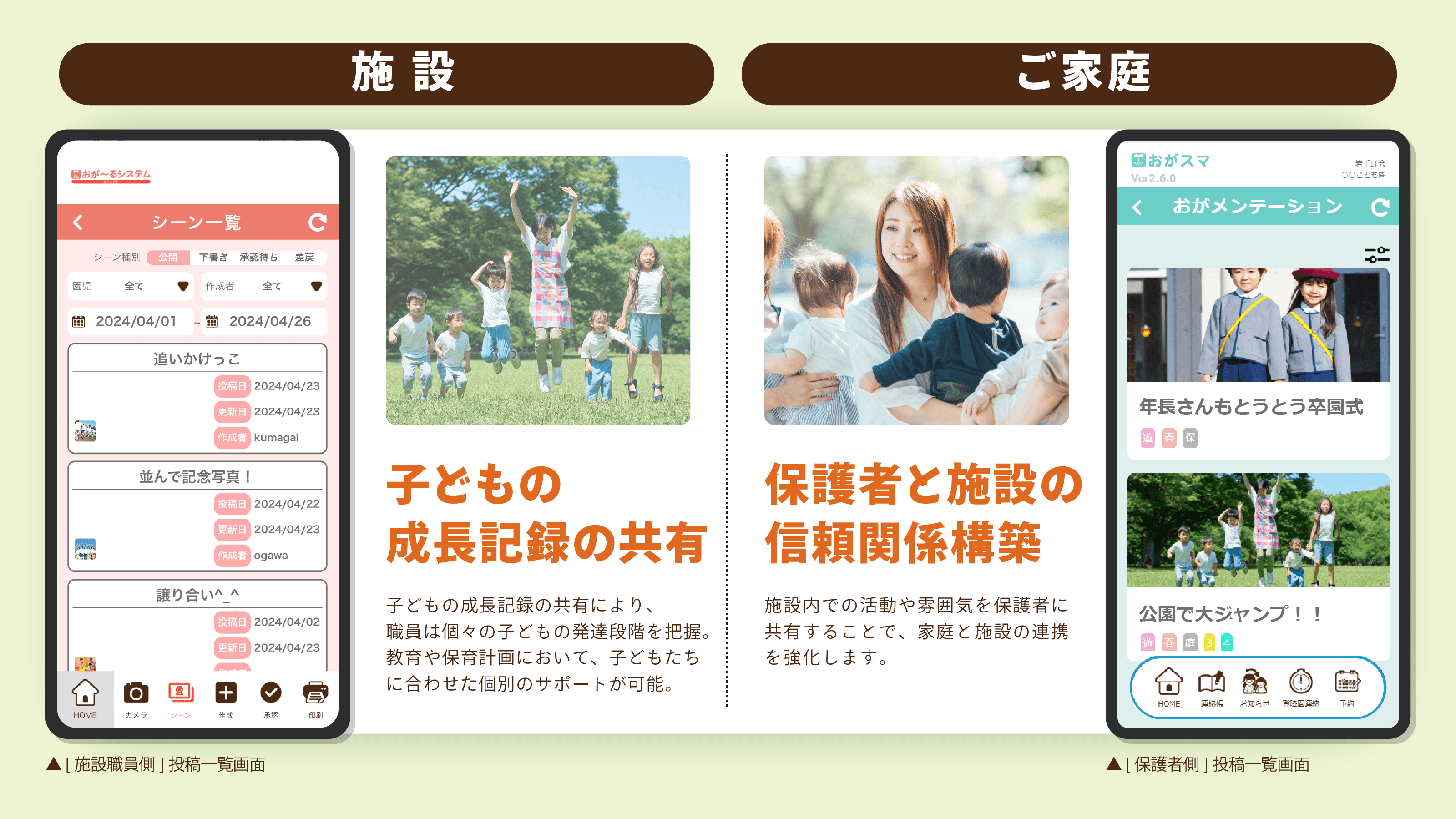 施設職員は職員向けアプリ「おが~るシステムSMART」から子どもの成長記録・共有ができます。