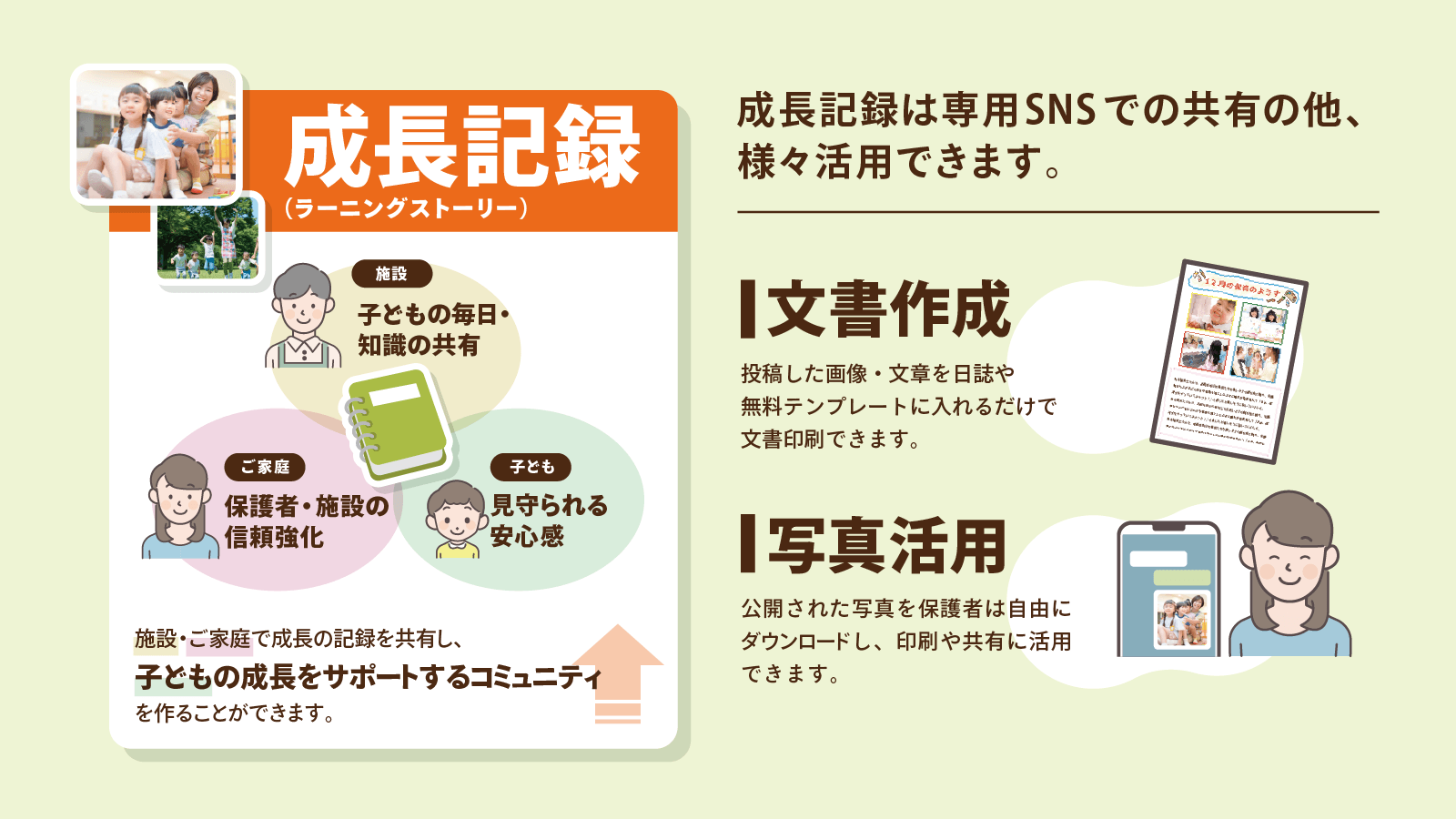 投稿した「成長記録」は専用のSNSの他、文書作成や写真配信・印刷など様々活用できます。