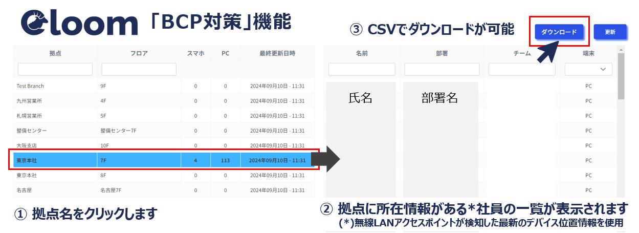 拠点ごとに出社している社員の一覧を表示します。CSVでダウンロードも可能です。