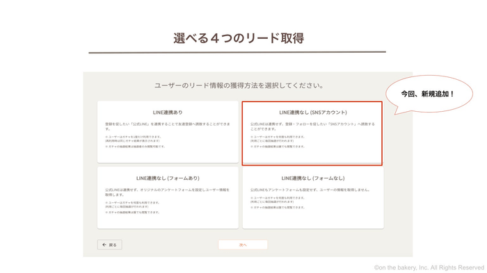 ユーザーに診断コンテンツやオンラインガチャを利用してもらう際に、自社のSNSアカウントのフォローページを経由させることが可能となりました。