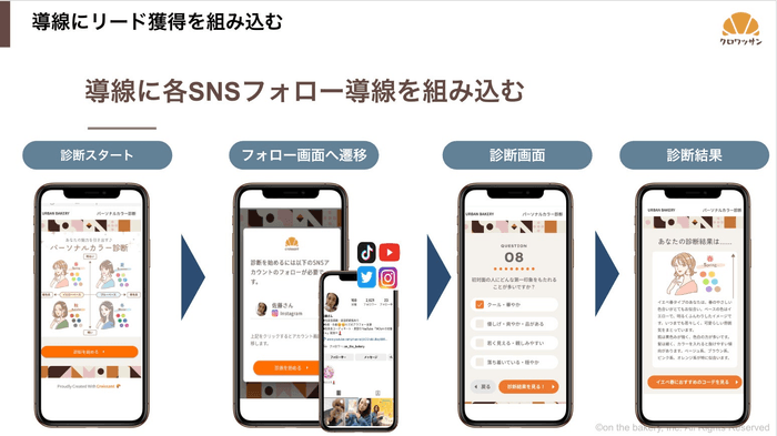 SNS・インフルエンサーマーケティングを支援する株式会社on the bakery(本社:神奈川県横浜市 代表取締役:井戸 裕哉)は、企業と顧客の接点を創出する診断コンテンツ・オンラインガチャ「クロワッサン」に新機能として「SNSフォローページへの遷移機能」を追加します。