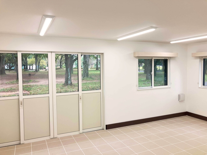 「ぼうけんハウス」はコンテナ建築の強みを生かし、大きな開口部を特徴としています。さらに、子どもたちの安全性を考慮し、入口の段差をなくすためにランドピアのバリアフリーコンテナ技術を採用しています。