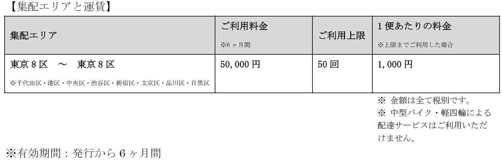 7月より、一部のユーザーを対象として、サブスクリプション(定額制)サービスのテスト運用をスタートしております。この度のテストプランでは、前払いで50,000円(税抜)をお支払いいただき、集配エリア内の自転車・原付による無料配達50回分のチケットをお渡ししております。バイク便や自転車便を毎週2~3回程度ご利用される方は、相場の約半額※でサービスをご利用いただくことができます。