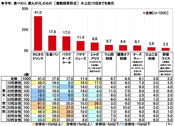 全回答者(1,000名)に、ブームになった食べ物の中で、今年、食べたり、飲んだりしたものを聞いたところ、「タピオカドリンク」(41.0%)が最も高く、次いで、「生食パン」(17.9%)、「バスクチーズケーキ」(17.0%)、「バナナジュース」(11.4%)、「じゃがアリゴ(『じゃがりこ』にお湯とチーズを入れて混ぜたもの)」(9.6%)となりました。