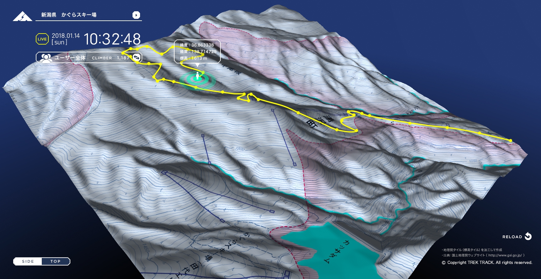 専用のIoTデバイスを持ったユーザーの行動データを収集し、山中を移動した軌跡をWebサイトや専用アプリで確認できる他、家で待つ家族やスキー場管理者などがリアルタイムに3Dマップで位置情報を確認することができます。対象エリアのどこに、どれだけのユーザーがいるのか集中管理できるため、スキー場内のパトロールや業務の効率化にも繋がります。