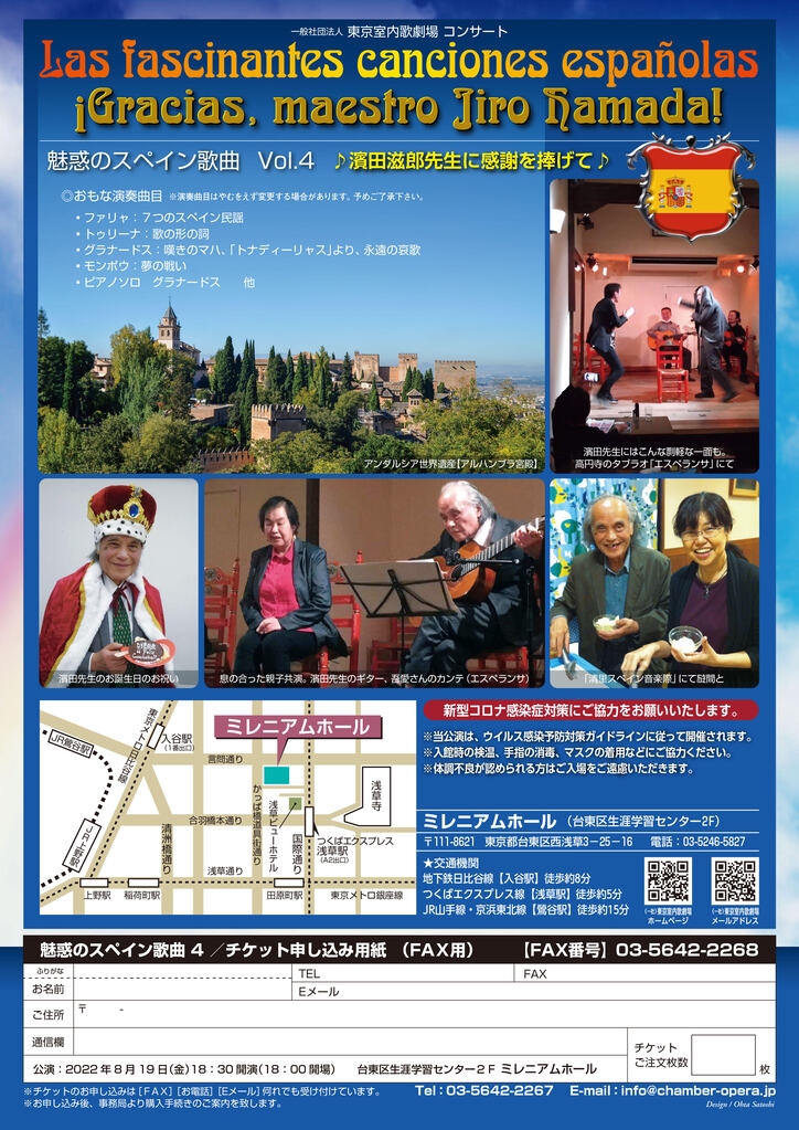 ⼀般社団法⼈東京室内歌劇場(東京都中央区、代表:杉野正隆)主催、『魅惑のスペイン歌曲Vol.4 ♪濱田滋郎先生に感謝を捧げて♪』が2022年8月19日 (金)に台東区ミレニアムホール(東京都台東区西浅草3-25-16 2階)にて上演されます。