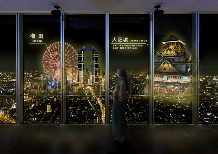 今年のテーマは、大阪をぐるっと回るを意味する「 ~Go Around OSAKA~ 」。360 度回遊できるハルカス300(展望台)の特長を活かし、各方角に合わせて大阪の名所がプロジェクションマッピングで出現します。ハルカス300(展望台)の北面窓には大阪城が、また南面窓には仁徳天皇陵古墳が出現するなど、ハルカス300(展望台)を一周すると様々な大阪の名所を知ることができます。