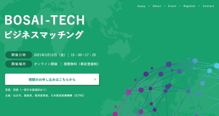 (※)当イベントは、ジェトロと経済産業省が地方への外国企業誘致促進を目指す「地域への対日直接投資カンファレンス(Regional Business Conference)」の中で採択された「東日本大震災からの復興と新たな防災関連産業の創出に向けたオープンイノベーションによる東北地域への対日直接投資促進プロジェクト」(申請者:仙台市、福島県)の一環イベントとして開催されるものです。RBCの詳細はこちら(https://www.jetro.go.jp/news/releases/2020/dc782a974d7e45c0.html)。