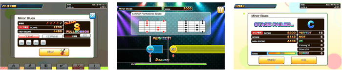 ポップ、ロック系を中心とした課題曲でパワーコードやストローク奏法を実践的にトレーニングすることができます。演奏後に表示されるスコアにより上達度合いがわかります。また各曲のゲーム画面では、使用コードと演奏アドバイスを確認することができます。
