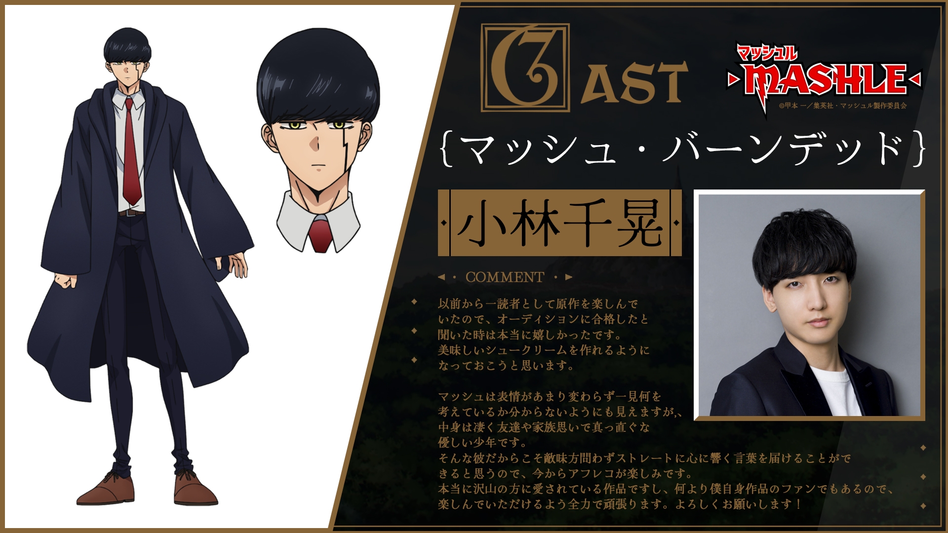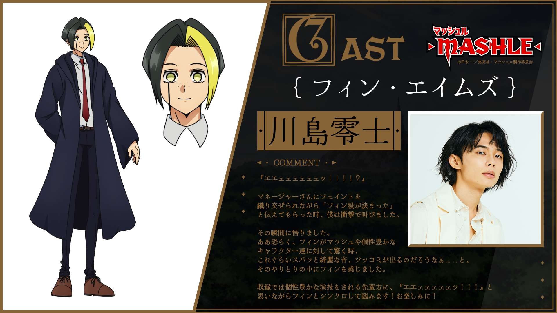 すでに解禁済みの主人公マッシュ・バーンデッド役小林千晃に加え、フィン・エイムズ役に川島零士、ランス・クラウン役に石川界人、ドット・バレット役に江口拓也、レモン・アーヴィン役に上田麗奈と、今勢いに乗っている豪華キャストが集結︕