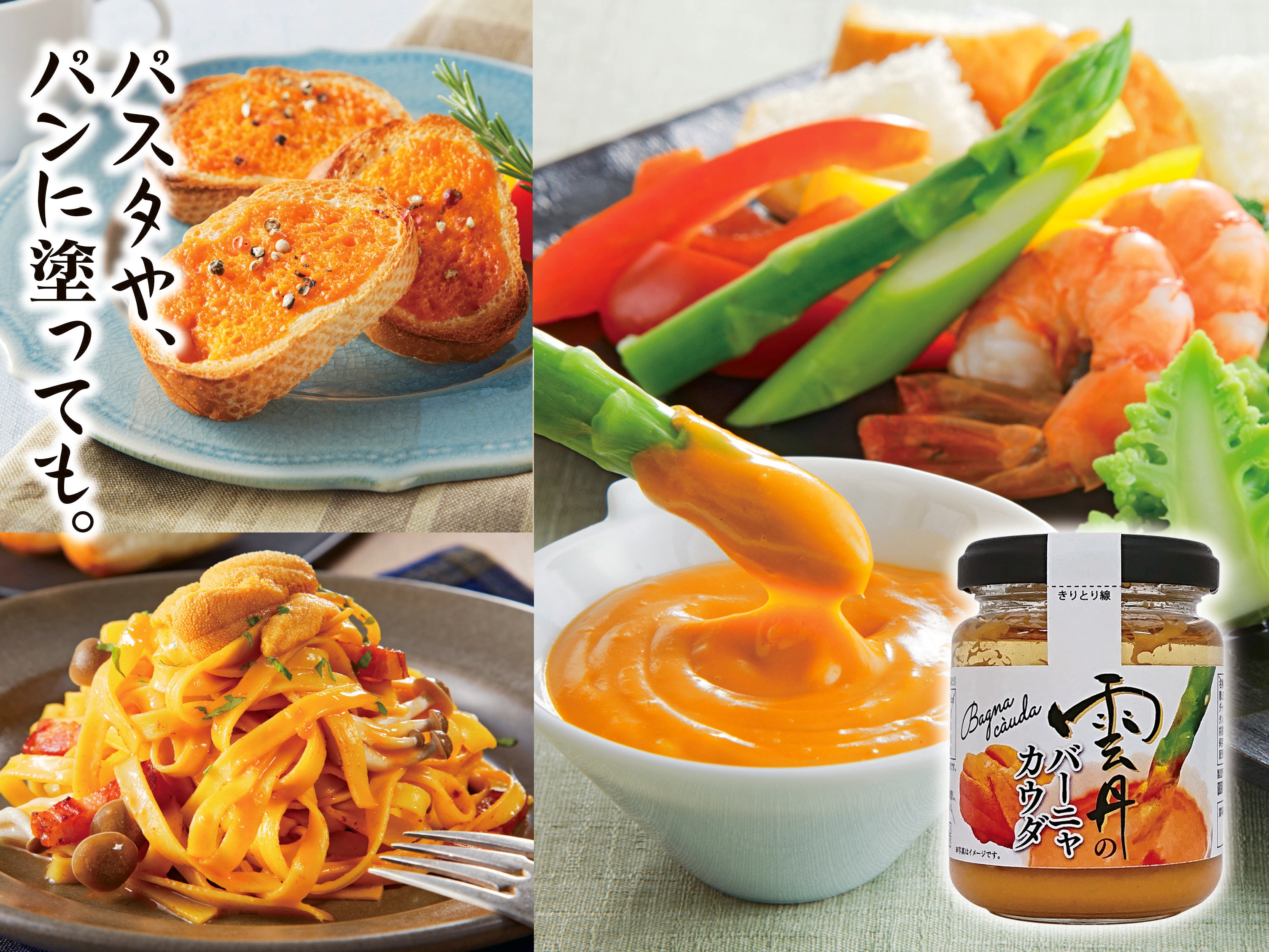 野菜スティックなどの季節の野菜と雲丹のバーニャカウダをお楽しみいただくのはもちろん、パスタ・パンなどとの相性もバッチリ!新しい雲丹調味料の味わいを是非お楽しみください。
