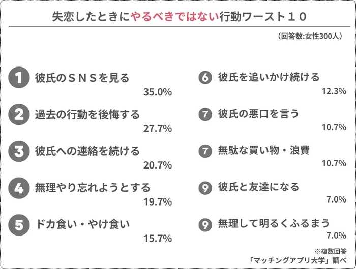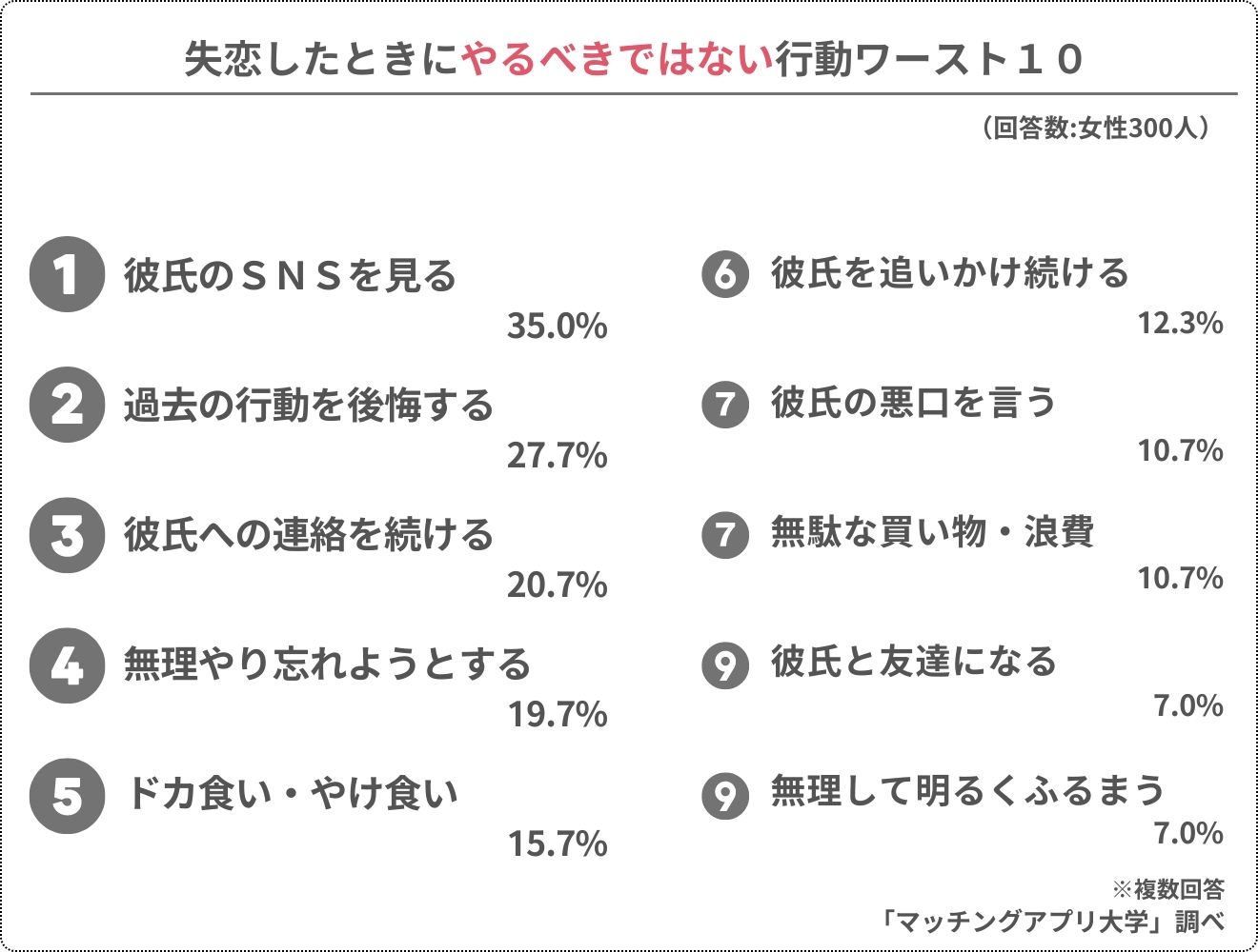 300人の失恋経験者の皆さんに、失恋から立ち直るために取った行動を聞いてみました。結果は次の通り。