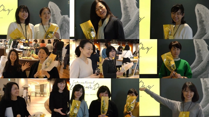 当日は黄色を象徴カラーとして、女性社員への感謝の気持ちとしてミモザのブーケを配布しました。