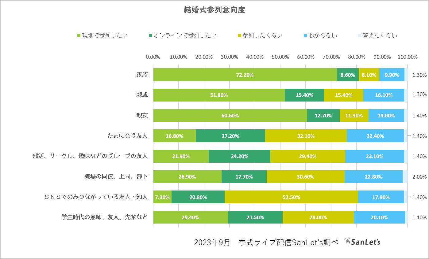 新郎新婦との関係性別に、結婚式への参列意向を「現地」「オンライン」「参列したくない」のいずれかを聞きました。家族では現地で参列したい意向が72%、親友でも現地で参列したいが60.6%と高くなりました。一方、たまに会う友人や部活、サークル等グループの友人では、「オンラインで参列したい」がそれぞれ27.2%、24.2%と「現地で参列したい」を上回りました。