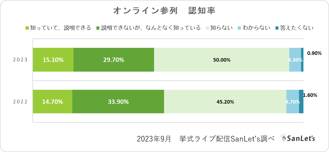 結婚式、もしくは結婚イベントの一部をオンラインで配信するスタイルがあることを「知っていて、具体的に説明できる」「なんとなく知っているが、説明はできない」方を合わせると45%の方が何らかの形で知っていると答えました。前年の48.6%と比べると、認知率は微減しています。