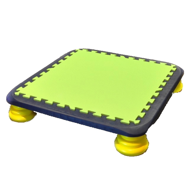 「バンバンボード」は床に接地するウレタン製のスプリングで反発力を作るだけでなく、床への振動を抑えます。また、安全性を考慮し、子どもが飛び跳ねる天板は高さ12.5cmと普通のトランポリンの約半分程度の高さで、天板の角は丸く加工されています。