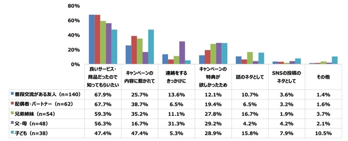 一方、紹介した商品・サービスの項目別で比較すると「スマホやインターネット」は「普段交流がある友人」に紹介した割合が他の商品・サービスに比べてやや少ないが、「配偶者・パートナー」「父・母」に紹介した割合は他の商品・サービスと比較してより多く占めていることが分かります。スマートフォンの通信プランや、インターネット回線の契約は「家族割」などの割引プランを提供しているサービスが多いためか、生計を共にする相手へ紹介するケースがより多く見られました。