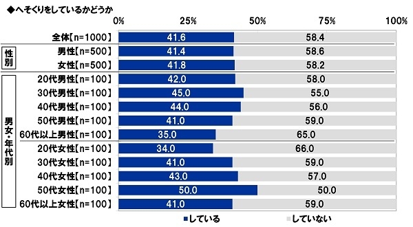 まず、へそくりをしている人の割合をみると、全体では41.6%、男性では41.4%、女性では41.8%でした。