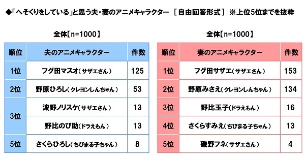 また、妻のアニメキャラクターでは、1位「フグ田サザエ(サザエさん)」(153件)、2位「野原みさえ(クレヨンしんちゃん)」(134件)、3位「野比玉子(ドラえもん)」(16件)、4位「さくらすみえ(ちびまる子ちゃん)」(13件)、5位「磯野フネ(サザエさん)」(4件)となりました。