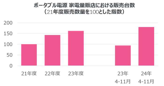 日本は地震や台風などの自然災害が多く、その影響で停電が発生するケースも多い。このような非常時にスマートフォンや家電製品に給電できるポータブル電源の需要が高まっている。家電量販店における2024年4~11月の販売数量は前年同期比90%増と、約2倍に成長した。