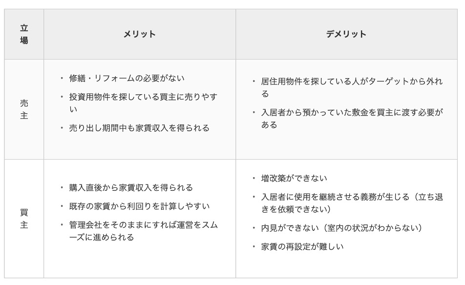 売主にとっては、売却活動期間中も家賃収入を得られるのがメリットです。投資用物件を探している買主にとっては、購入時点での空き室リスクがないことがメリットといえます。
