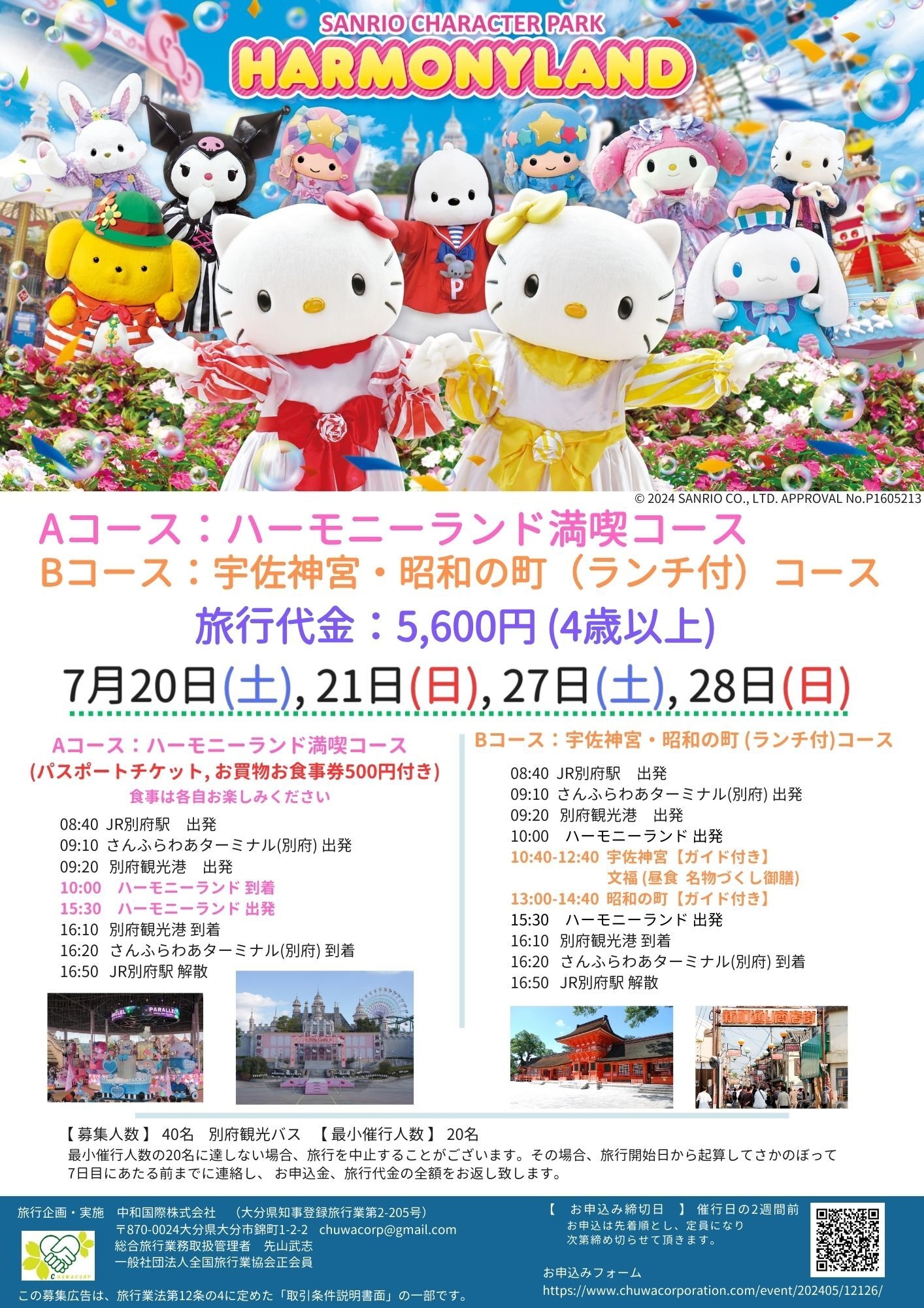 中和国際株式会社は、2024年7月20日(土)、21日(日)、27日(土)、28日(日)に開催する「ハーモニーランド満喫コース」と「宇佐神宮・昭和の町コース」の申し込み受付を開始いたしました。