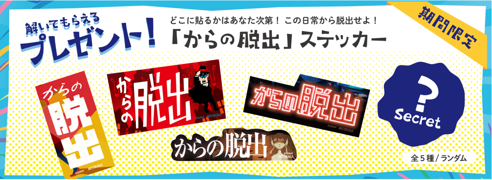 さらに、謎を解いた後もう一度リアル脱出ゲーム常設店舗にご来場いただいた方限定で、「からの脱出」ステッカーもプレゼントしちゃいます!