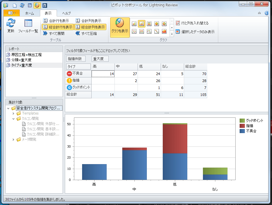 複数のレビューの指摘データは、専用のピボット分析ツールで自由に集計できます。指摘事項の登録状況から、品質上注意すべき対象が見えてきます。また、プロジェクト内のレビュー状況もまとめて把握できます。