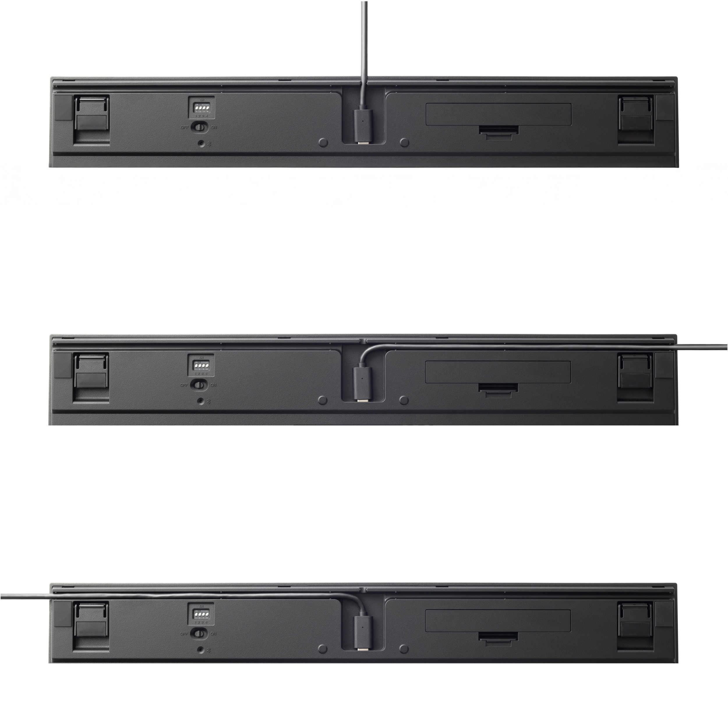USBケーブルでの有線接続の際の、机上でのケーブル取り回しの煩わしさを解消するため、底面にケーブルガイドを搭載し、左右両サイドと中央の3方向からケーブルを引き回すことができる設計になっています。周りのデバイスやパソコンの配置に合わせて、配線することが可能です。