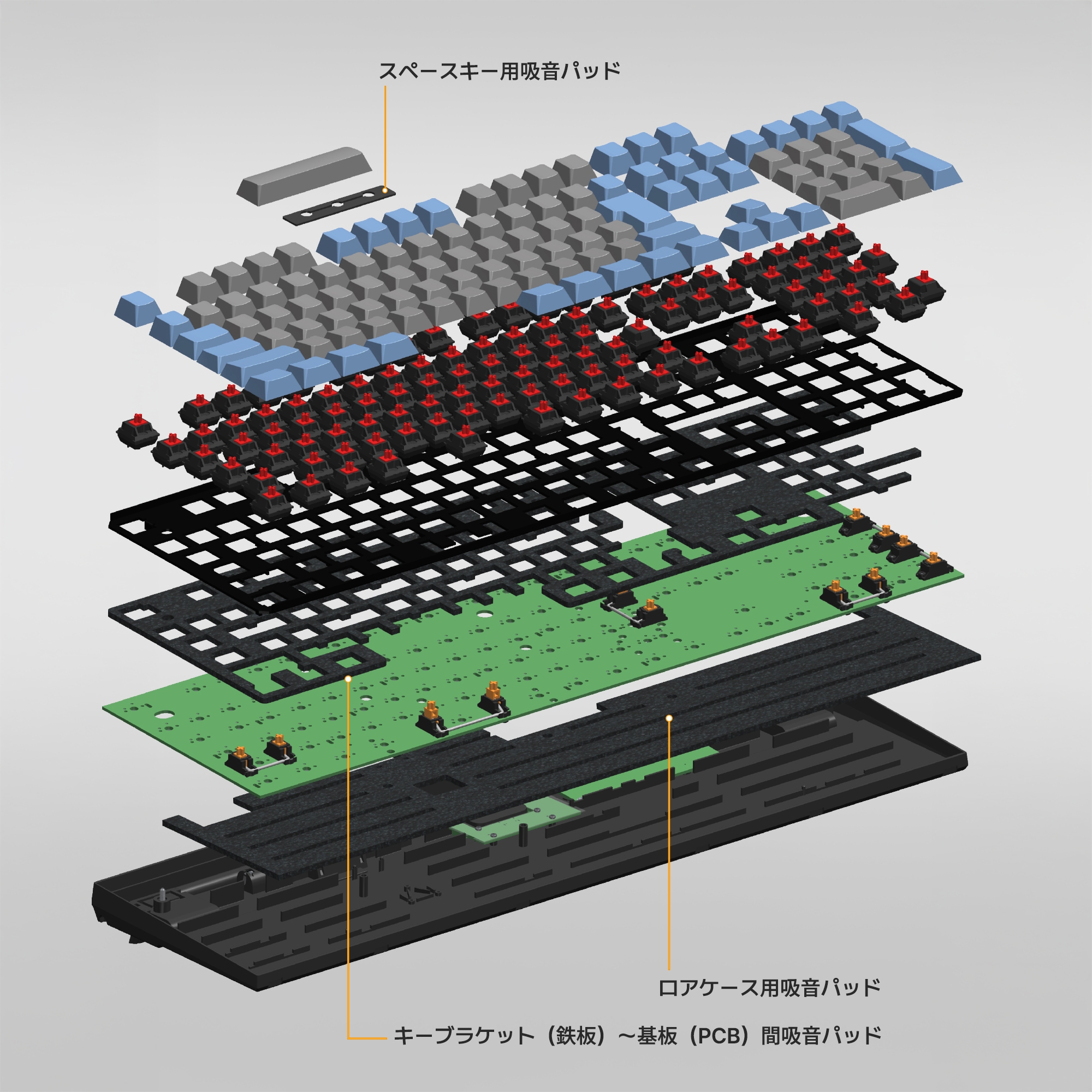 キーの底打ち時やキースイッチレバー(キーステム)が戻った際に発生する、キーブラケット(鉄板)の反響音を低減するため、ロアーケース(キーボードの下筐体)と基板(PCB)の間、基板とキーブラケットの間に吸音パッドを内蔵しました。さらに、広い空間があり、相対的に打鍵音や反響音が大きくなりがちなスペースキーの裏にも吸音材を貼付しています。
