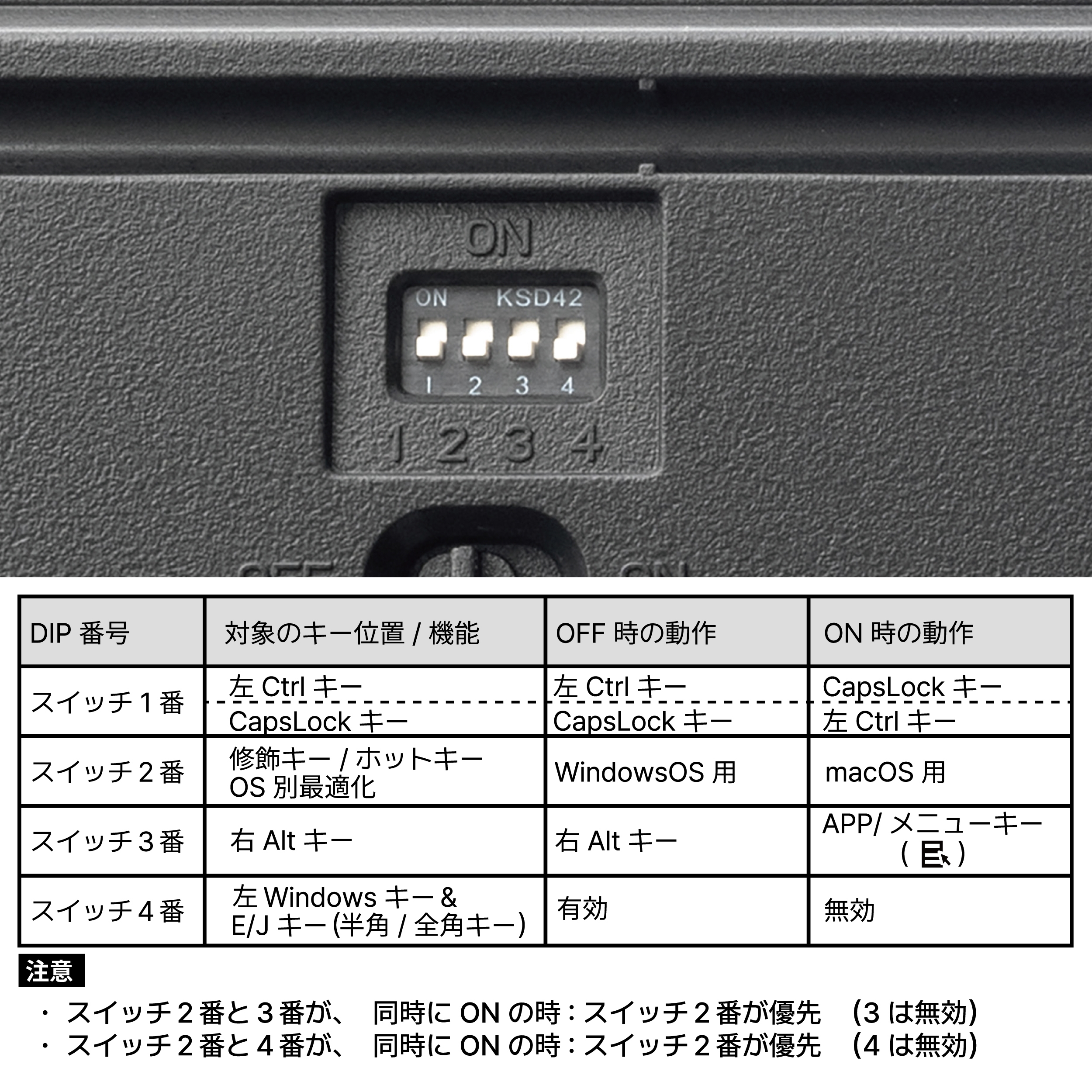 キーバインド変更・入力制限等、利用頻度が高いと想定される設定は、背面搭載した4チャンネルのDIPスイッチに所定の機能を割り当てており、物理的なスイッチのON/OFFで切替できる仕様になっています。また、テンキーレスモデルであるFC750RBT同様、DIPスイッチ2番をONにして、修飾キーの位置や動作をmacOS標準キーボードに近づける便利なモードを搭載しています。