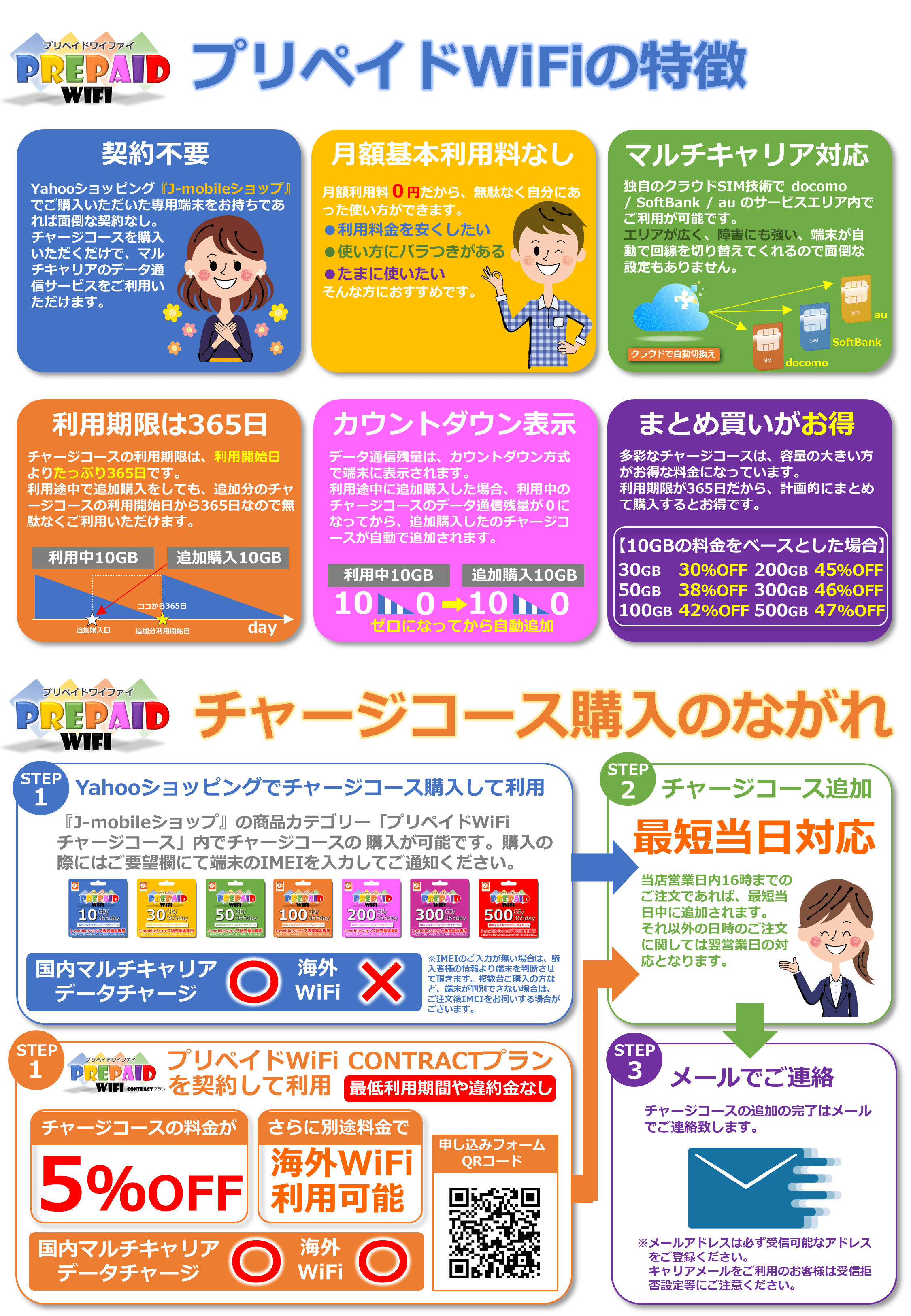 『プリペイドWiFi』は面倒な手続きが一切なく、契約不要で利用可能なチャージ式WiFiサービスです。マルチキャリア(docomo・Softbank・au)に対応しているのでカバーエリアが広く、通信障害時も安心してご利用いただけます。また、チャージコースの有効期限は利用開始日より365日で、購入したデータ通信容量を無駄なく利用できます。