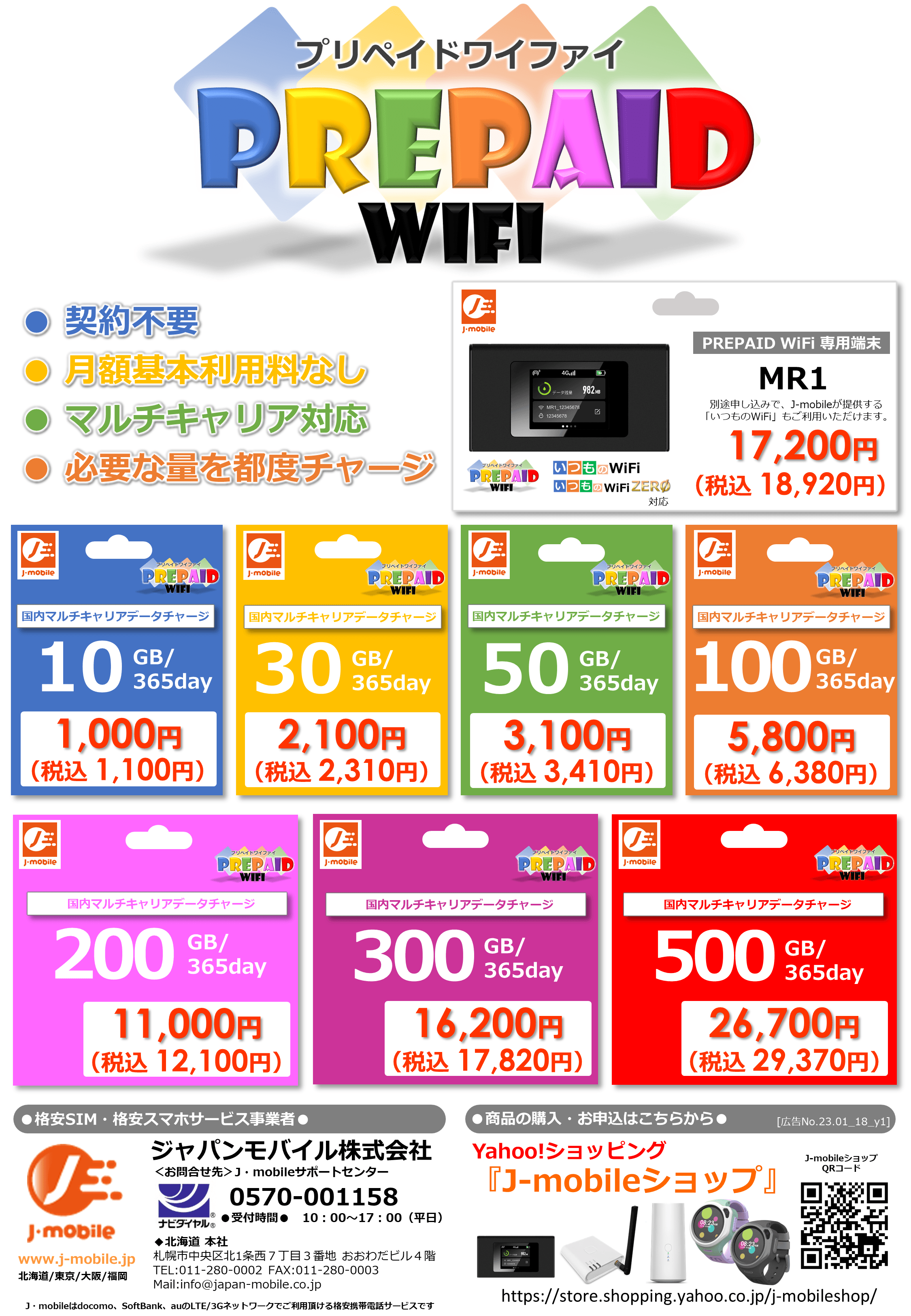 ジャパンモバイル株式会社(本社:札幌市中央区、代表取締役社長:賣場崇大、以下「J-mobile」)は、Yahoo!ショッピング『J-mobileショップ』で、契約不要のチャージ式データ通信サービス『プリペイドWiFi』を、2023年1月20日より販売開始します。