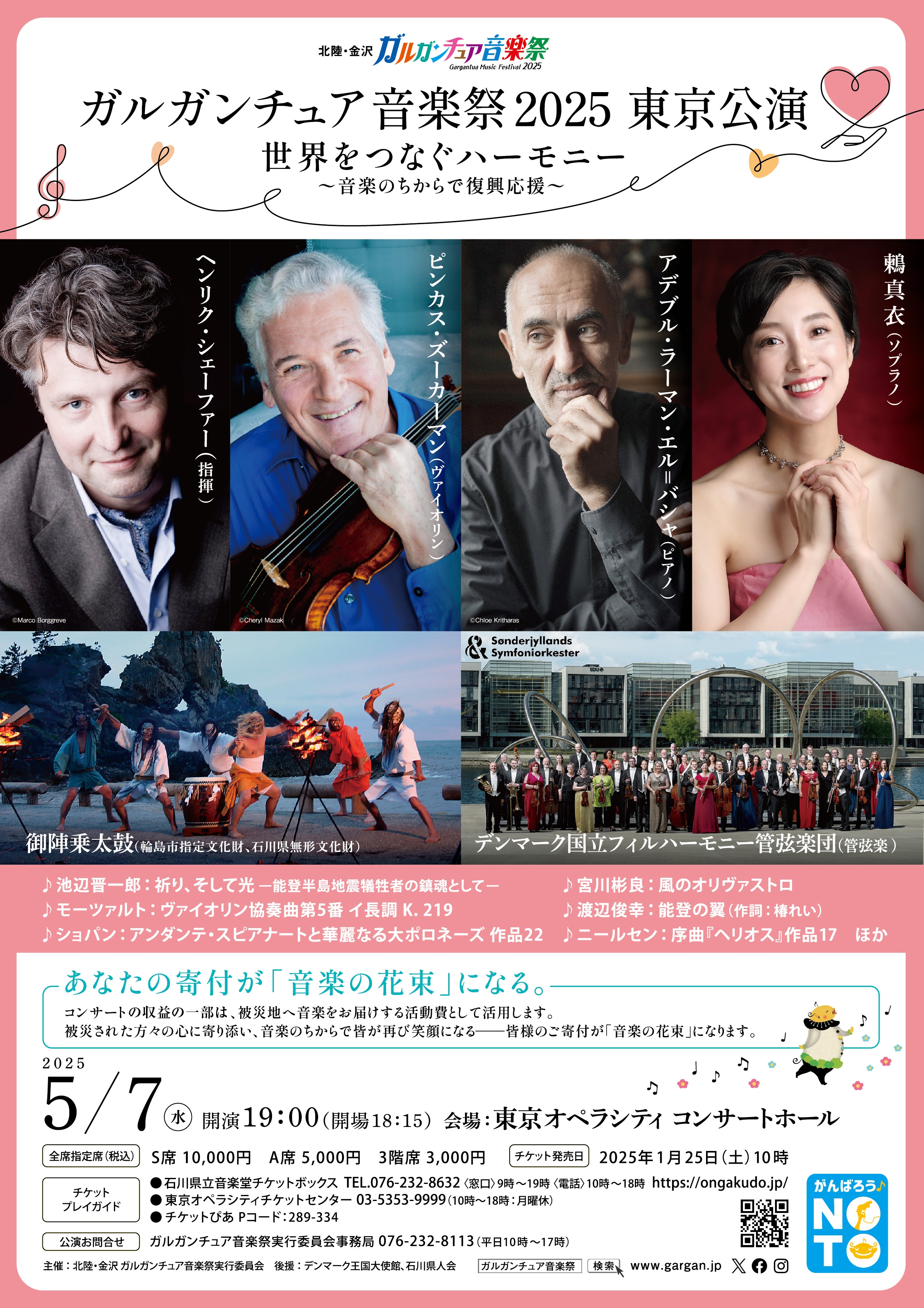 当日は、50年以上にわたり世界の第一線で活躍し続ける伝説的ヴァイオリニストであり、指揮者・教育者としても世界中から尊敬を集めているピンカス・ズーカーマンをはじめ、19歳で第10回ショパン国際ピアノコンクールに優勝し、一躍その名を世界に知らしめた名手アブデル・ラーマン・エル=バシャら、世界的な演奏家たちが東京に集結します。また鶫 真衣(石川県観光大使/陸上自衛隊中央音楽隊ソプラノ歌手)が、七尾市在住の詩人・椿れい氏による詩をもとにした《能登の翼》を歌い、東京から能登へ希望の歌声を届けます。フィナーレでは、450年続く輪島市の伝統芸能『御陣乗太鼓(ごじんじょだいこ)』が登場。復興への祈りを込めた力強い響きが、会場を包み込みます。