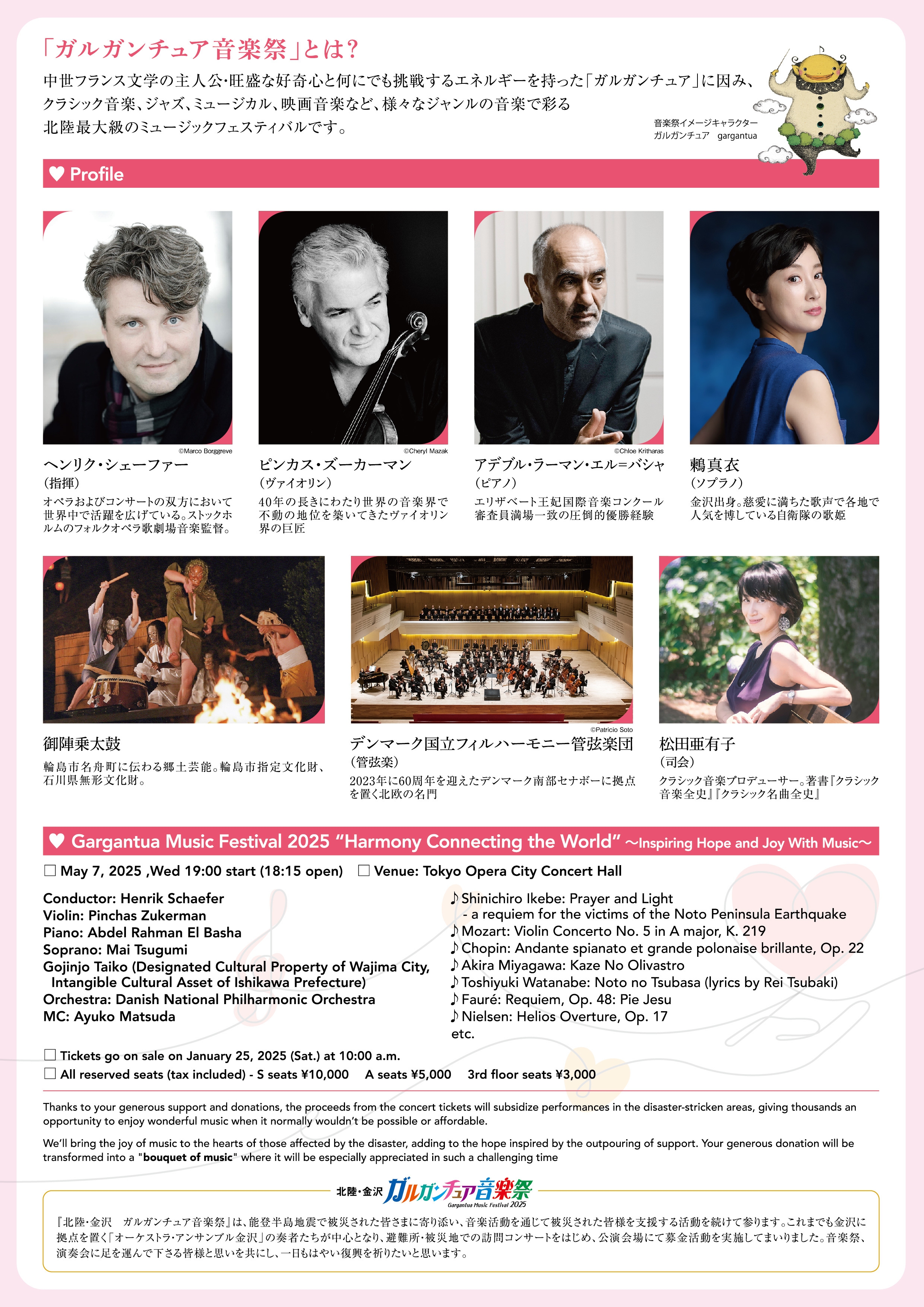 本公演を通じて、より多くの皆様に能登の現状を知っていただき、復興支援の輪が広がることを心より願っております。チケット収益の一部は、ガルガンチュア音楽祭実行委員会を通じて、被災地での音楽活動の支援や、被災された方々に音楽を届ける活動に活用します。